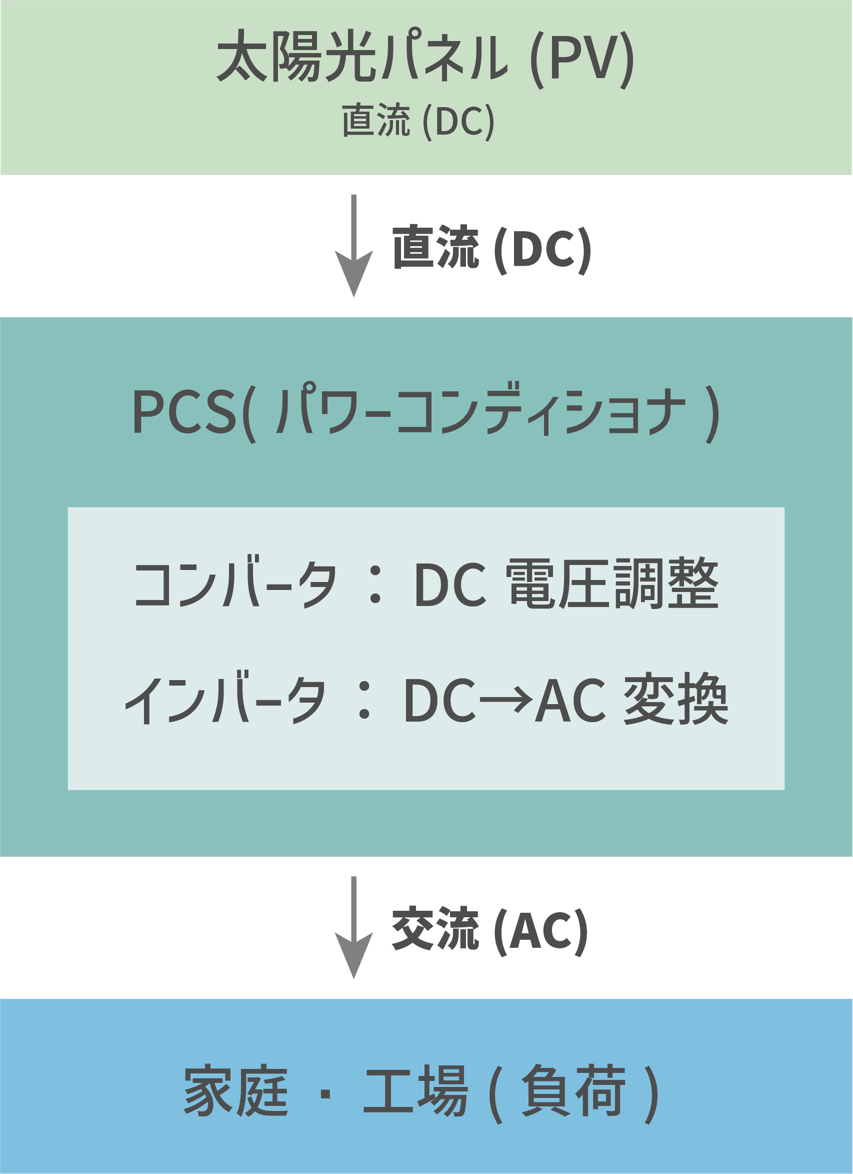 部品の集まり(インバータ+コンバータ) をシステム(PCS)としてまとめ、電力を安全に使える状態に整える装置というイメージです。