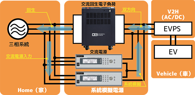 V2H(ビークルトゥホーム) に代表されるEVPSの評価には、双方向性のある電源装置が必要となります。交直両用回生電子負荷装置と逆電流保護機能のある交流電源の組み合わせや直流電源との組み合わせで、双方向性のある交流電源や直流電源を模擬することができます。