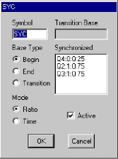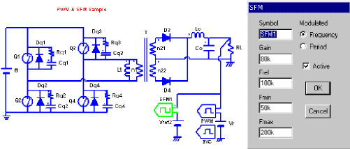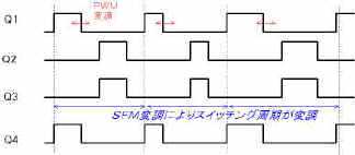 PWM制御素子でQ1を制御し、Q2〜Q4はSFM(周波数変調制御器)によりスイッチング周波数を制御しています。ここでSYC(同期制御器)のBaseType(同期基準)はBegin(スイッチング周期の立ち上がり)に設定していますので各スイッチのタイミングは下図のように制御されます。