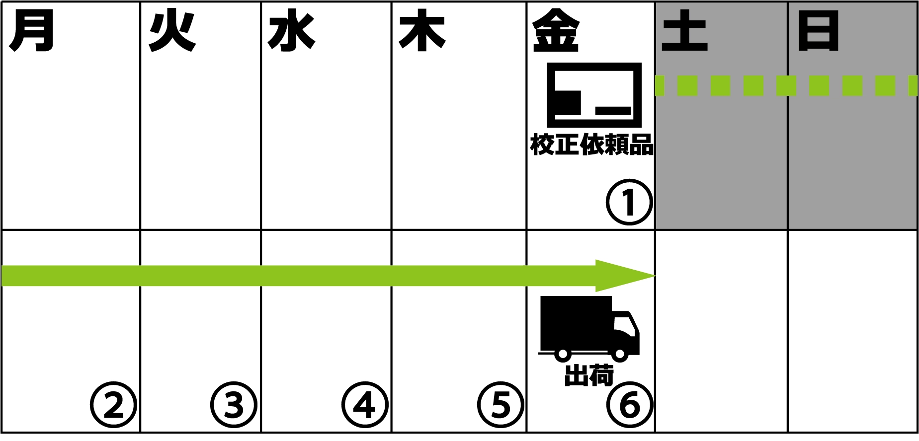 校正ご依頼品受領日が1日目となります。例えば、月曜日に受領した場合、製品は翌週月曜日までに発送致します。