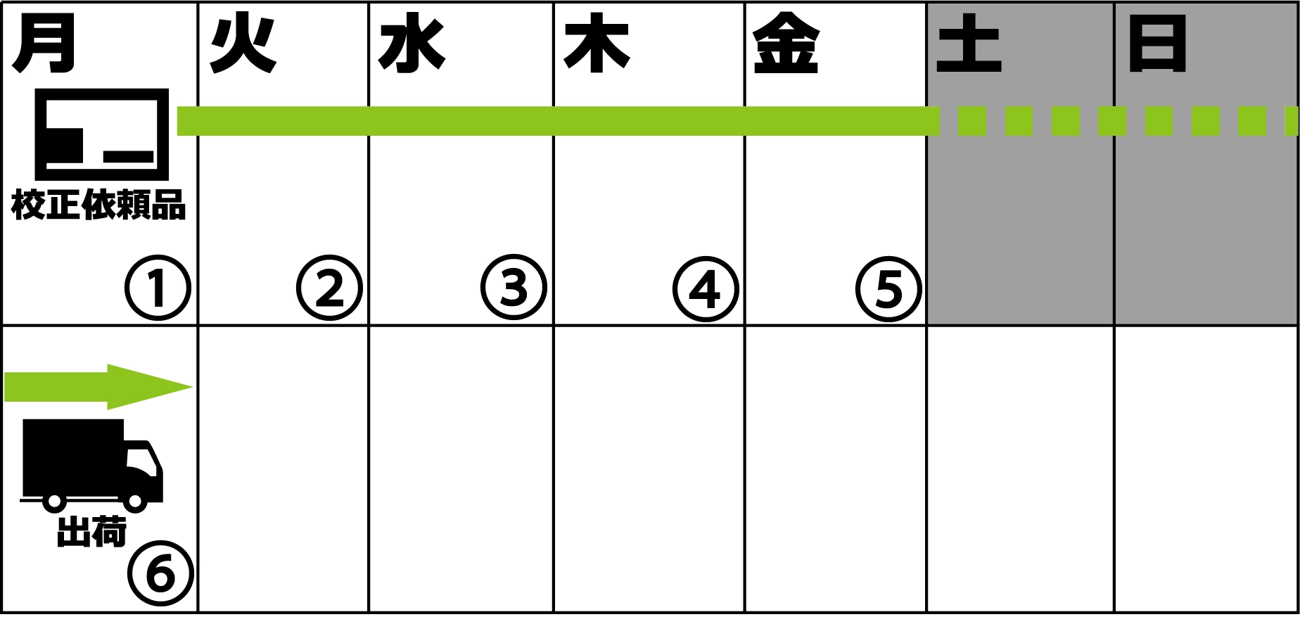 当社の校正サービスは通常10~20営業日の日数を頂いておりますが、「つばめ準特急校正」では対象製品の校正からご返却までをお預かり後6営業日以内に実施するサービスをご提供いたします。
