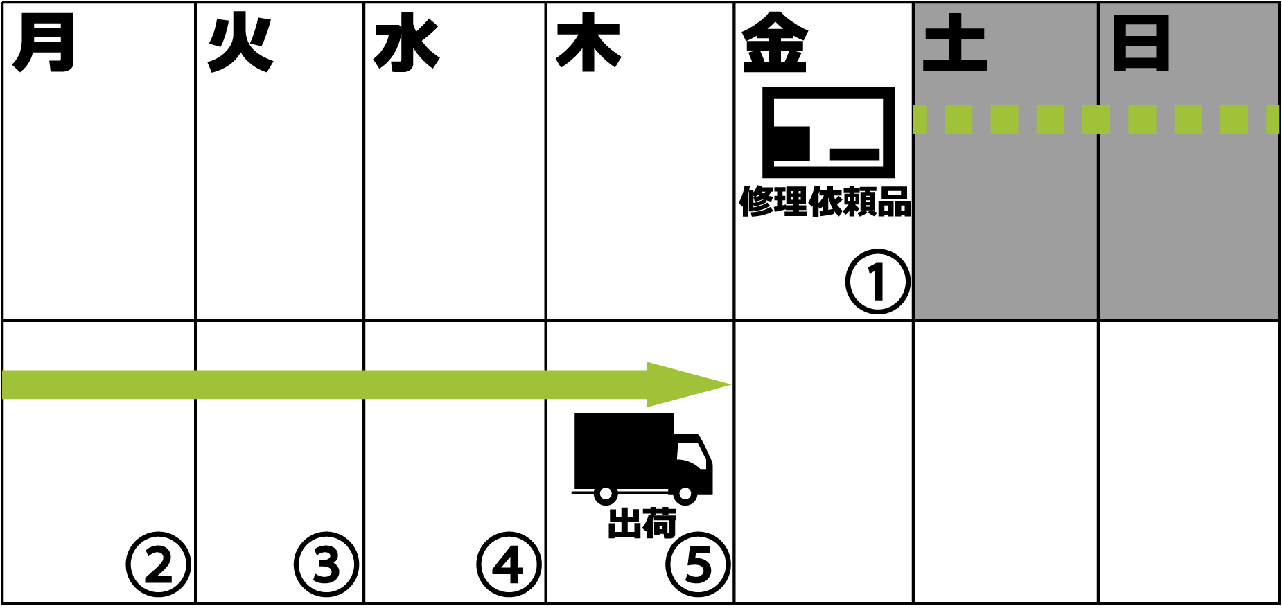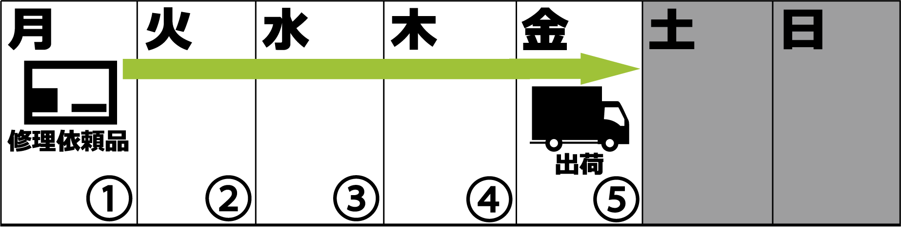 修理ご依頼品受領日が1日目となります。例えば、月曜日に受領した場合、製品は金曜日までに発送致します。
