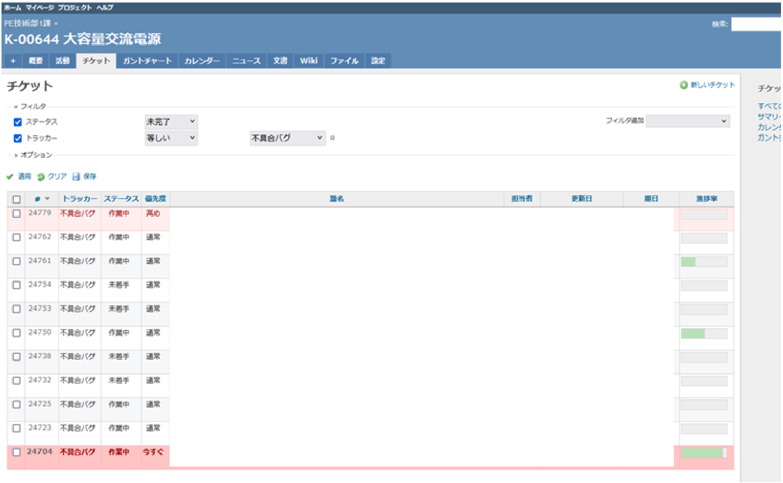 幸いなことに、こうした開発者のニーズを満たす便利なツールが数多く存在します。当社では「Redmine」というプロジェクト管理ツールを採用しています。このツールは、バグ管理ツールに限定されない、幅広い機能を持つプロジェクト管理ツールですが、バグ管理にも最適なツールの一つだと考えています。