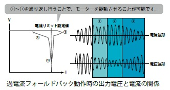 モーターやコンプレッサーなどは一時的に大きな起動電流が流れます。この起動電流により交流電源の保護回路が働くと試験ができません。これを回避するために開発された過電流フォールドバック機能により、モーターやコンプレッサーなどの試験にも安心してお使い頂くことができます。