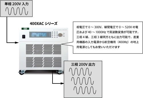 このような場合、交流電源400XACシリーズを使用することにより、単相しか無い環境で三相3線もしくは4線の環境を構築することが可能です。