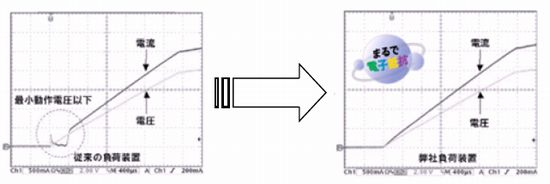 一般的な電子負荷装置は「最小動作電圧」という制約を持っています。これは、電子負荷内部に負荷として使われているデバイスに流れる突入電流を防止するための「突入電流防止回路」が働くことによるもので、従来は避けられないものとされていました。