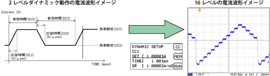 LoadStationシリーズのダイナミック動作は負荷電流値を最小2レベルから最大16レベルまで指定することができます。従来の電子負荷装置は2レベルのみの単純な波形のみでしたが、これが16レベルに拡張されることで多様な試験に対応することができます。例えば最大250kHz のPWM 波形を再現することも可能となります。