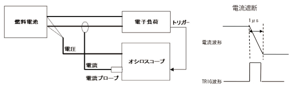 燃料電池や2次電池などの内部インピーダンス測定を「電流遮断法」で行うとき、電流の変化はより高速なほど電圧の変曲点を観測しやすくなります。Load Stationシリーズでは最高1μsで電流を遮断することが可能であり、またオーバーシュートやアンダーシュートの無い理想的な電流波形となっていますので、電流遮断法の測定に最適です。また、電流遮断のタイミングに同期したトリガ信号出力を装備しているため容易にオシロスコープでの波形観測が可能です。