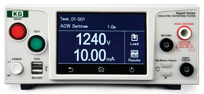 耐電圧試験を実施するときは、DUTのL端子とN端子を短絡してからテスターのHVリードに接続し、DUTの接地端子をテスターのリターンリードに接続します。試験電圧は絶縁レベルに依存するため、基本絶縁は定格電圧に1200 Vacを加えたもの (通常は1500 Vacから2200 Vac) に耐える必要があり、強化絶縁は定格電圧に2400 Vac を加えた電圧に耐える必要があります。