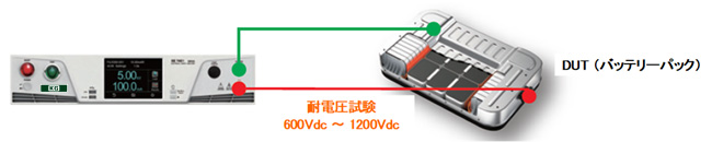 耐電圧試験は、バッテリーパックの構造が適切に組み立てられ、絶縁不良が発生していないことを保証するものです。 そのため、UL 2580 では、定格の2倍のDC電圧 (通常は600 Vdcから1200 Vdc) をバッテリーの正極/負極とシャーシ間に60秒間印加することを要求しています。このときDUT が故障してはなりません。