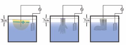 供試物の内部を水で満たして水槽中に固定し、供試物の内側と外側の水を電極として行う試験です。