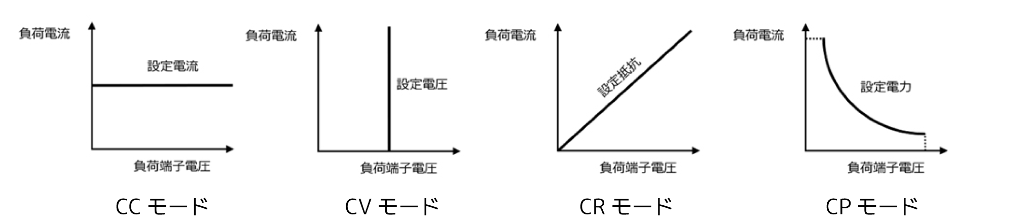 ・電源はCV(定電圧)が多く、交流電子負荷は主にCC(定電流)、CR(定抵抗)、CP(定電力)で動作させます