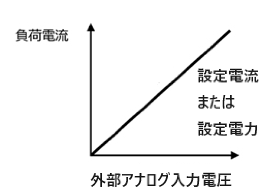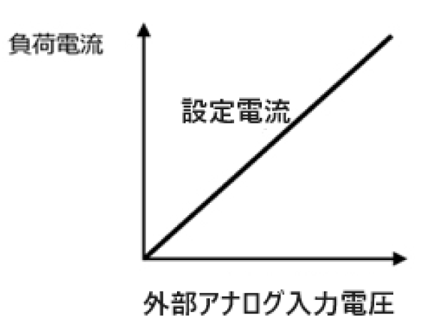外部アナログ入力は、電子負荷の外部アナログ入力端子に0~10Vの直流電圧を入力し、アナログ電圧と比例的に負荷電流を増減させるモードです。