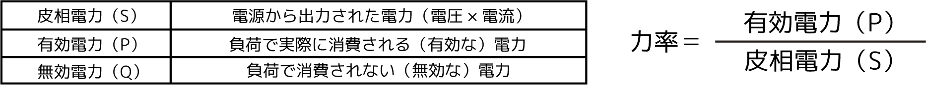 力率を一言で言うと「電源から出力された電力が有効に使われている割合」となります。交流電力は3種類分類され、以下のように定義されます。