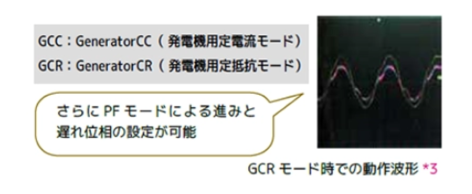交流電子負荷にはGCC(発電機用定電流モード)とGCR(発電機用定抵抗モード)があります。エンジン発電機のように出力波形に歪みが含まれていても、安定して負荷をとることが可能です。