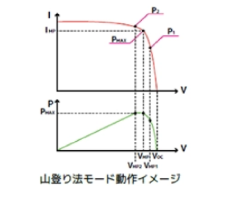 MPPTモードはユニークな負荷モードです。PVパネルを直接接続してIV特性などの試験が可能です。MPPTは最大電力追従点と呼び、最大電力が得られるまで動作電圧と電流を調整し続ける制御方法です。山登り法といわれる制御方式を採用しております。