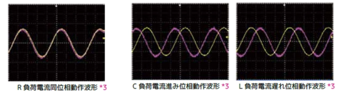 | 力率変動時の動き | 力率(位相)を変更し、正弦波での位相可変![]() 無効電力の再現可! | CFを変更し、正負範囲のみ位相変更![]() 無効電力の再現不可 | LCの容量を可変させ、正弦波での位相可変![]() 無効電力の再現可! |
