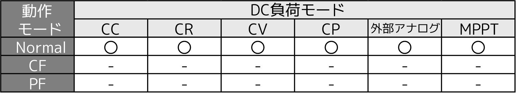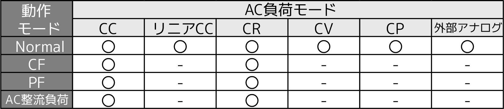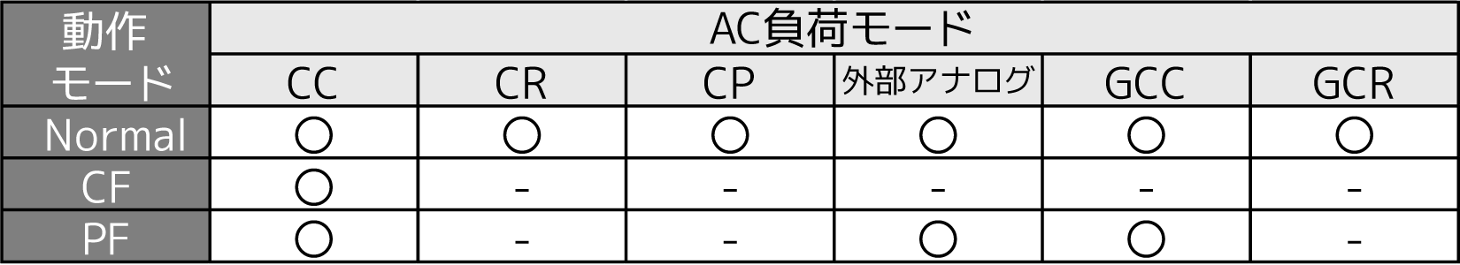 以下が電子負荷の各負荷モード(列)とAC動作モード(行)をマトリックスにしたものです。