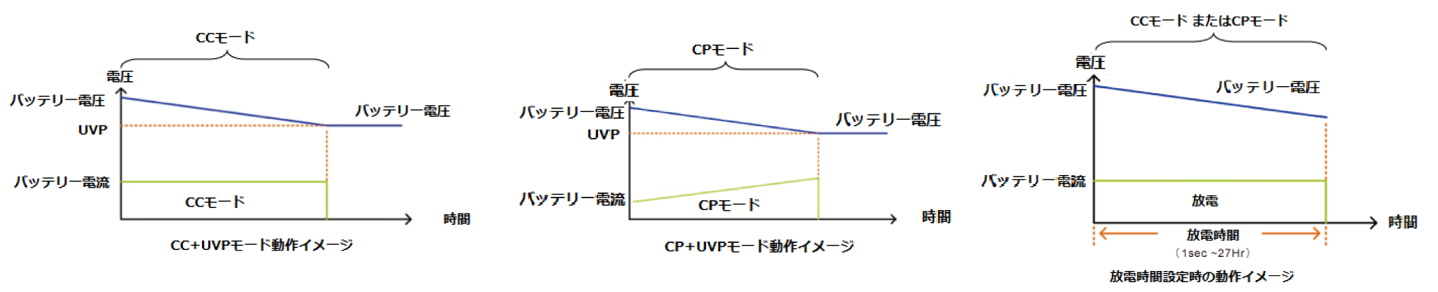 3つのバッテリー放電モードを搭載。指定電圧ならびに放電時間を設定し安全に放電試験が可能です。