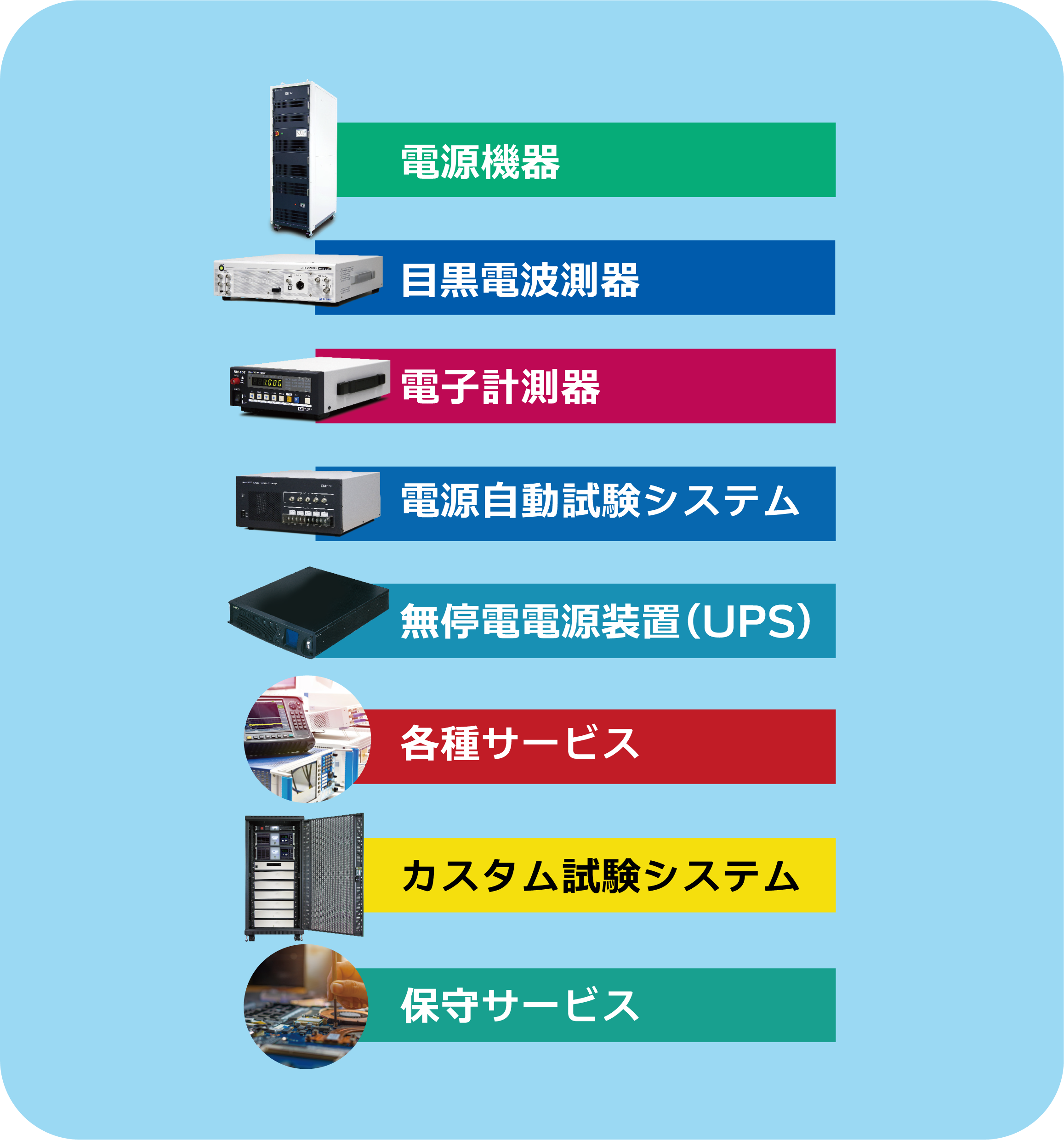 - 電源機器=回生型電源、回生型電子負荷、直流電源、交流電源、交流電子負荷、直流電子負荷