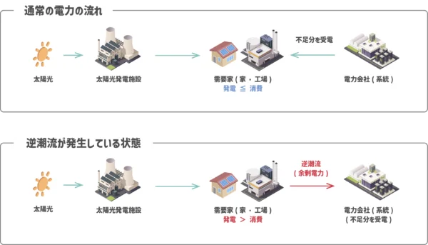 逆潮流とは、太陽光発電などで発電された電力を、系統連系を通じて商用電力系統へ送り返すことを指します。通常、電力は「電力会社 → 需要家」という向きに流れますが、太陽光発電設備などを設置すると「需要家 → 電力系統」という […]