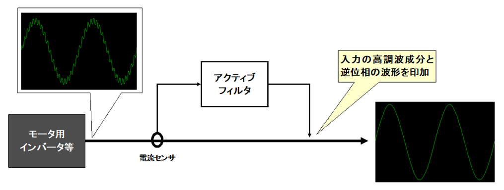 高調波対策用アクティブフィルタも入力の高調波電流を検出し、それと逆位相の波形を生成して合成することにより高調波の無い綺麗な波形を出力します。