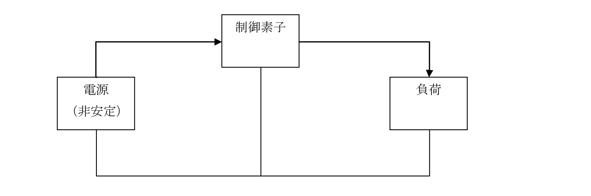 次に、繋げるのは何か?というと、結論から言えば下図ように「安定化していない電源から制御素子を通して負荷に接続する」ということになります。