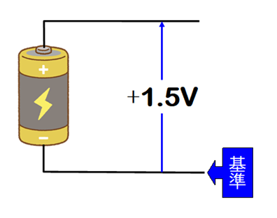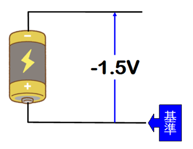 つまり、マイナス端子を基準(ゼロボルト)としたときのプラス端子の電圧が「+1.5V」ということですね。逆にプラス端子を基準とすれば、マイナス端子は「-1.5V」ということになります。