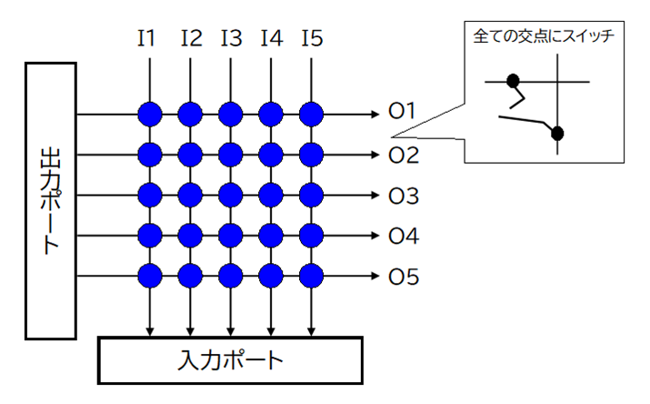 スイッチの数が少なければ一度にみることができるのですが、さすがに100個を超えると一度にみることはできません。(※)そのような場合、一般的には下図のようなキーボードマトリクスという方法で行います。