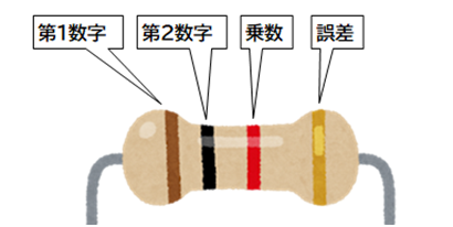 最も一般的な電子部品である小型の抵抗器には、下図のように誤差も含めると4本の帯(カラーコード)が印字されています。この帯の色によって、部品の定数がわかるようになっている訳です。(部品によってはもっと帯の数が多い場合もあります)