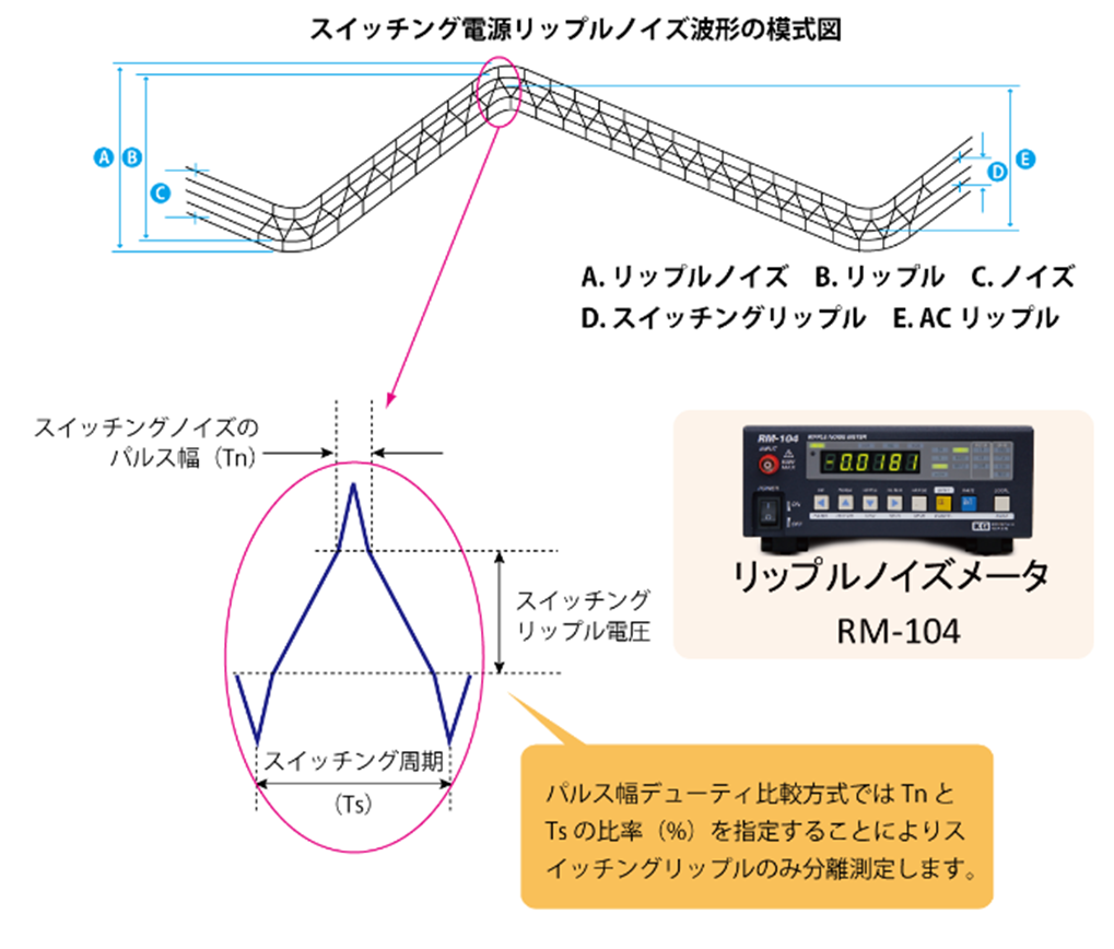 リップルノイズメータはスイッチング電源の直流出力に現れるリップルあるいはノイズ成分をワンタッチで測定し数値化できる「測定器」です。リップルノイズメータが現れる前は、オシロスコープを使って波形観測し、人間の目で測定値を読み取っていましたが、オシロスコープの操作ミスや読み取り誤差が無視できないことから、人間の手(目)を介さずに自動測定可能なリップルノイズメータが普及しました。