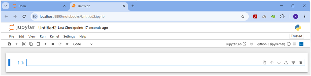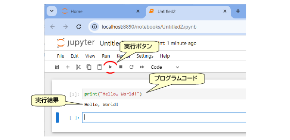 さきほど開いたJupyter Notebookに以下のプログラムを入力し、実行ボタン「▶」をクリックしてみてください。
