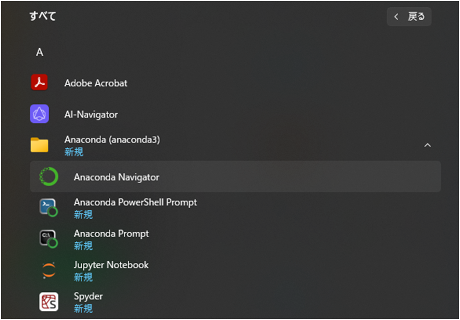 インストールされたプログラムリストの中から Anaconda Navigatorを起動します。