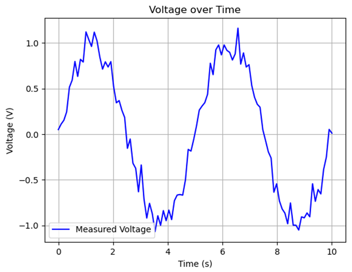 voltage = np.sin(2 * np.pi * time / 5) + 0.1 * np.random.normal(size=100) # 正弦波 + ノイズ