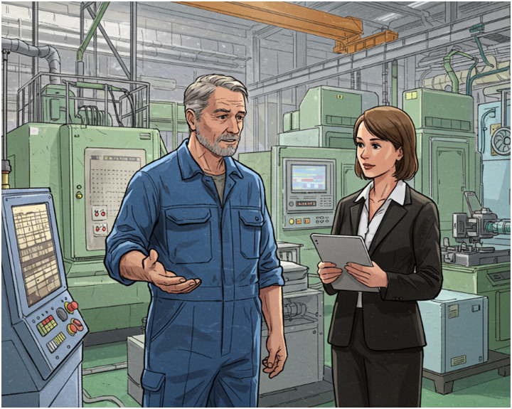 明るい声とともに入ってきたのは、計測技術研究所(KG)の営業担当、吉野ちあき。パキッとしたスーツ姿で、自信満々に長倉さんの前に立った。