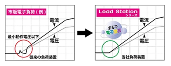 直流電子負荷装置は、電源やバッテリーなどの電気機器の性能評価や試験に不可欠な機器です。その中でも、当社の「Load Stationシリーズ」は、「まるで電子抵抗」と呼ばれる高速電流応答技術を搭載しており、最小動作電圧の概念が無く理想的な負荷特性を実現しています。
