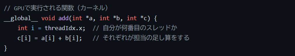 __global__ という見慣れない記述が目に入ると思います。これが「この関数はGPUで動かすよ」というCUDA特有の印です。