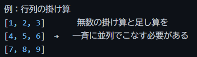 画面の何百万ものピクセルを、それぞれ色計算して同時に描画する必要があります。 - AIの場合(行列計算)