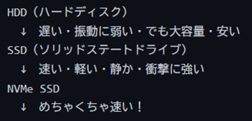 | NVMe SSD | 約3,000〜7,000 MB/s | 新幹線 🚄 |