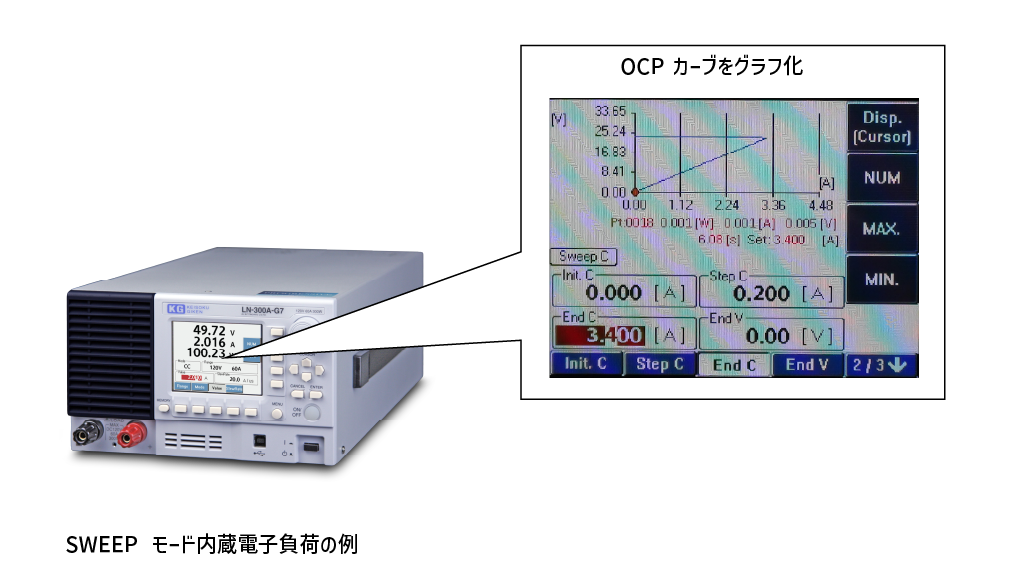 PC でのプログラミングが面倒な場合はSWEEP モードが内蔵された電子負荷を使えば電子負荷単体でOCP 機能試験をすることができます。つまり、OCP 機能試験プログラムに相当するものが電子負荷に組み込まれているもので、開始電流値や終了電流値などの必要なパラメータを設定して負荷ONするだけでOCP 機能試験を実施します。また、機種によってはOCP カーブのグラフ化に対応しているものもあります。