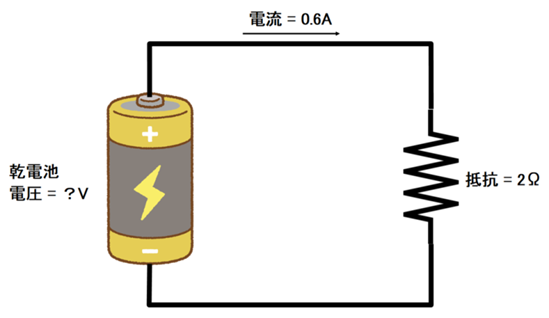 電圧 = 抵抗 × 電流 = 2Ω × 0.6A = 1.2V