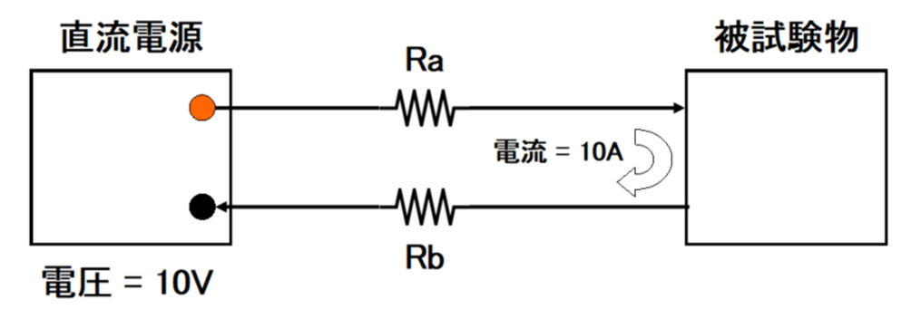 直流電源を10Vに設定し、電流が10A流れているとき被試験物には何Vの電圧が印加されているでしょうか? 「10Vに設定してるんだから10Vでしょ」と思われるかも知れませんが、実際は10Vよりも若干低くなります。この「若干」が電圧降下分ということですが、ここでオームの法則が登場します。