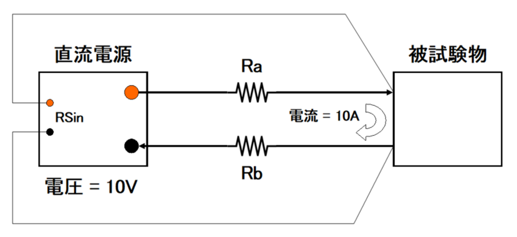 リモートセンシングのために「やること」は、直流電源のリモートセンシング入力(図ではRSin)を被試験物の電圧入力端子に接続するだけです。これにより被試験物に印加される電圧が設定電圧ピッタリになるように実際の出力電圧を持ち上げるように動作します。