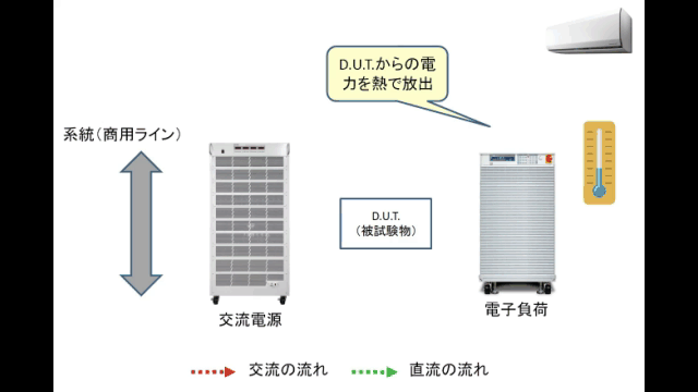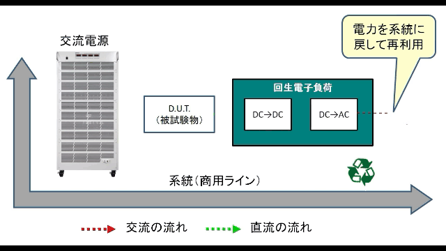 これに対して回生電子負荷は、電力を熱として放出するのではなく、交流に変換して再利用できるようにした電子負荷となっています。