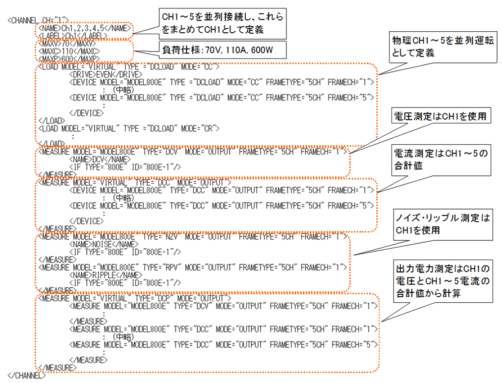 一般的に電子負荷の電流容量が不足したときに複数の電子負荷を並列に接続して電流容量を増やすことはできますが、その場合、それぞれの電子負荷に個別に電流値を設定することが必要です。このような場合、システム定義ファイルにより複数のチャンネルをまとめて仮想的なひとつのチャンネルとして定義すると、検査プログラムで設定した電流値を自動的に複数の電子負荷に振り分けて流してくれますので大変便利です。