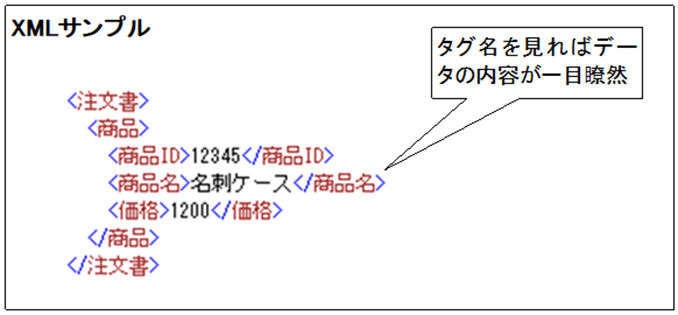 XMLを直訳すると「拡張可能なマークアップ言語」となりますが、HTMLでは固定になっていた「タグ」を自由に設定することができるためデータ構造の定義(システム構造の定義)に適しており、視覚的にも見やすくなっています。