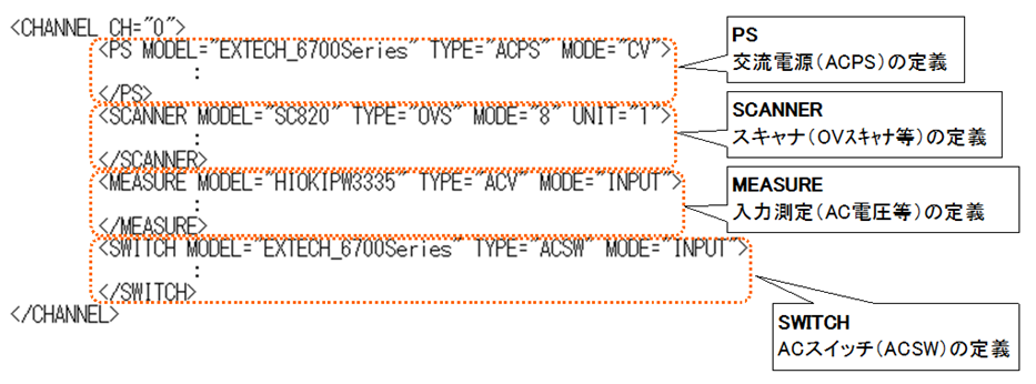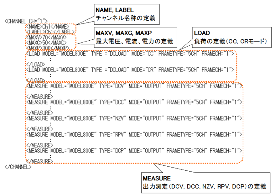 電子負荷やリップルノイズメータなど出力側に接続される機器の情報を定義しており、以下はCH1の記述例です。