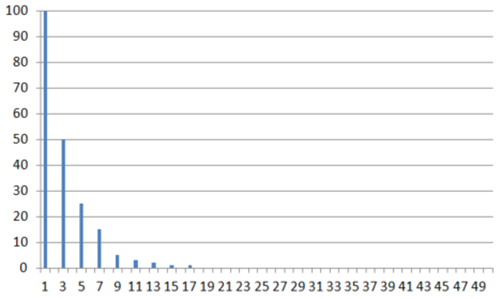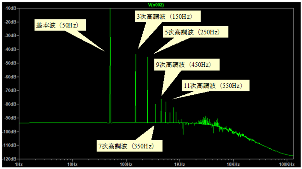 この波形を高調波解析(FFT解析とも言います)にかけると以下のようになります。横軸は周波数になっており、50Hzの部分(基本波)以外に150Hz付近(3次高調波)、250Hz付近(5次高調波)にレベルが大きくなっているのがわかります。このように、元の波形ではわかりにくい高調波のレベルを高調波解析によって視覚的に見ることができます。
