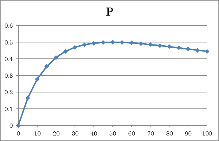 ここで、仮にE = 10V, R1 = 50ΩとしてR2(横軸)に対するPの値をExcelで計算すると次のようになります。