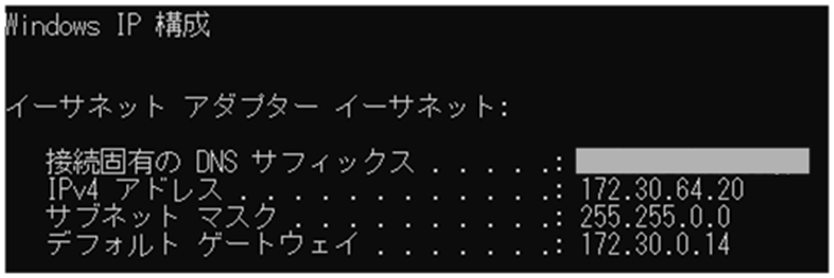 コマンドプロンプトを起動し、ipconfigコマンドをタイプしてみてください。以下のように表示されると思います。IPv4アドレスの部分が現在利用しているIPアドレスとなります。